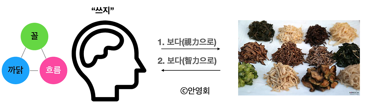 인용한 내용을 보면 다시 <한국말은 어떻게 나눠지는가?>에서 인용한 마디말의 구성 방식이 떠오릅니다. 동일한 앛씨말에 다른 겿씨말을 붙이면 의미의 씨는 그대로 유지한 상태에서 뜻의 변형이 가능해집니다.