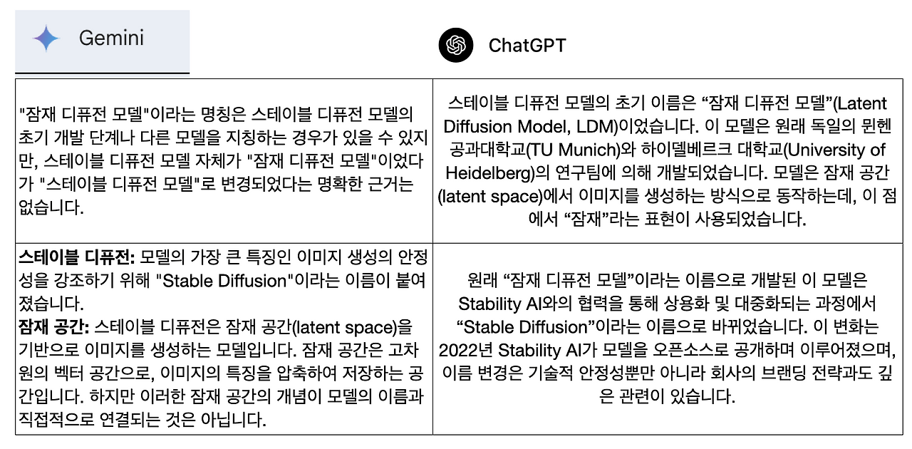 챗GPT는 책에서 내놓은 설명의 부연으로 봐도 될 듯한데, 제미나이는 잠재 디퓨전 모델이라는 이름이 스테이블 디퓨전 모델로 바뀌었다는 명확한 근거는 없다고 말합니다.[1]