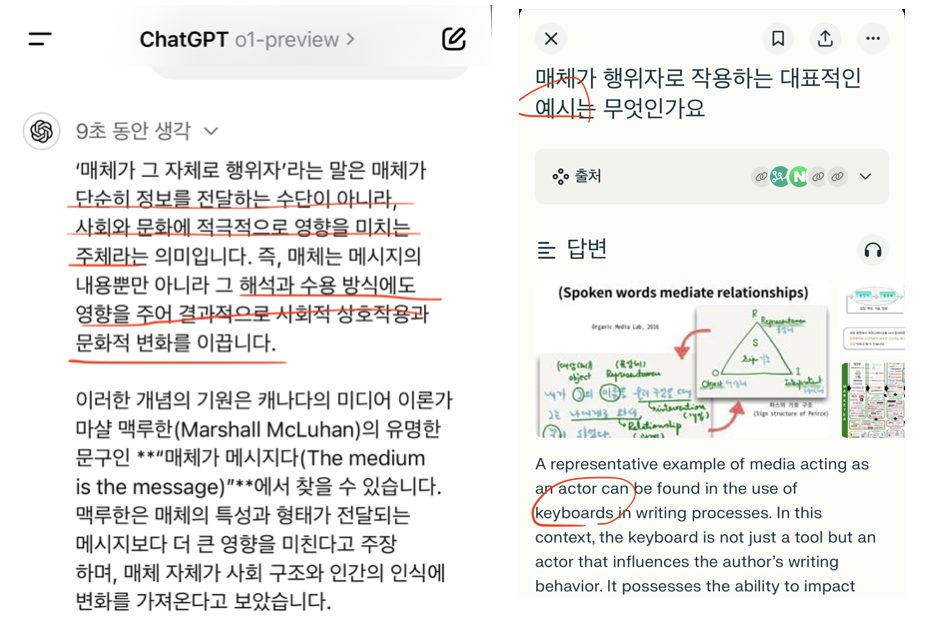 퍼플렉시티가 찾아 준 예시는 키보드 예시입니다. 키보드는 사용자에게 도구로만 작용하는 것이 아니라 글 쓰는 방식도 바꾼다고 합니다. 매일 브런치로 글을 쓰는 제가 공감하기 쉬운 예군요. 박구용 교수님은 튜브 물감이 나온 다음 밑그림을 그리는 행위가 사라졌다고 예를 듭니다. 과거에 최봉영 선생님이 필체가 인간성을 드러내지 않겠냐면 인공 지능의 쓰임새를 저에게 제시한 상황도 생각납니다. 저는 손글씨 쓰는 일이 거의 없다는 말씀을 드려 효용성에 의문을 제기한 일이 있는데, 이런 사고의 차이도 모두 매체가 문화에 영향을 끼친 사례들이네요.