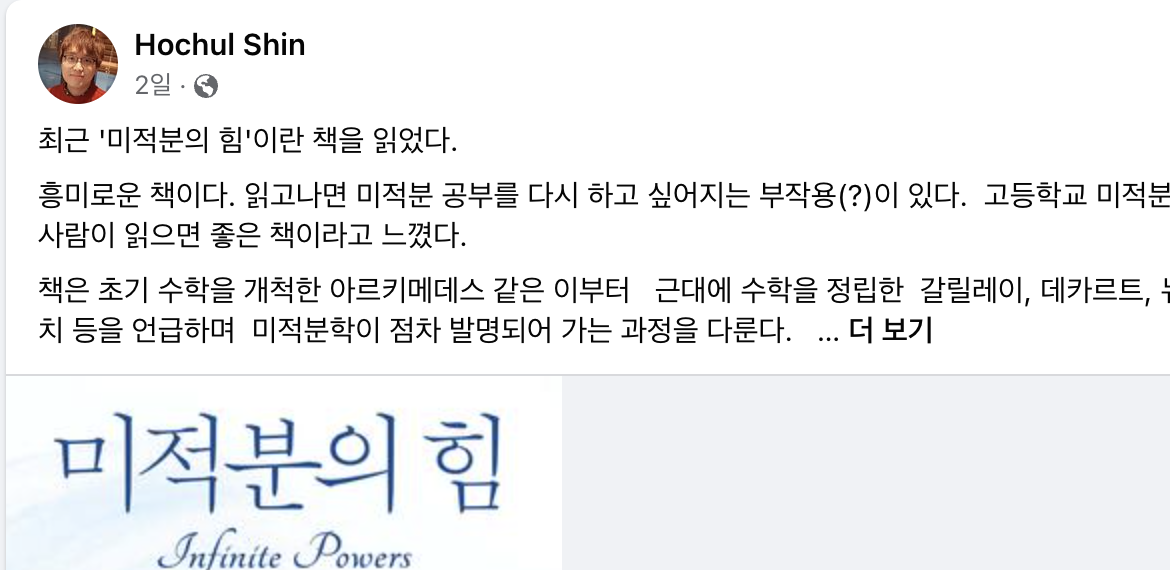 페북에서 <미적분의 힘>이라 책을 소개하는 글을 읽은 기억이 났습니다. 장바구니에 넣어두고 아직 주문하지는 않았습니다. 습관 문지기가 작동하고 있기 때문이죠. 비슷한 책을 사서 실패한 경험이 있기 때문에 구체적으로 어떻게 공부할지 아이디어가 떠오른 다음에 적절성과 타이밍을 판단하고자 합니다.