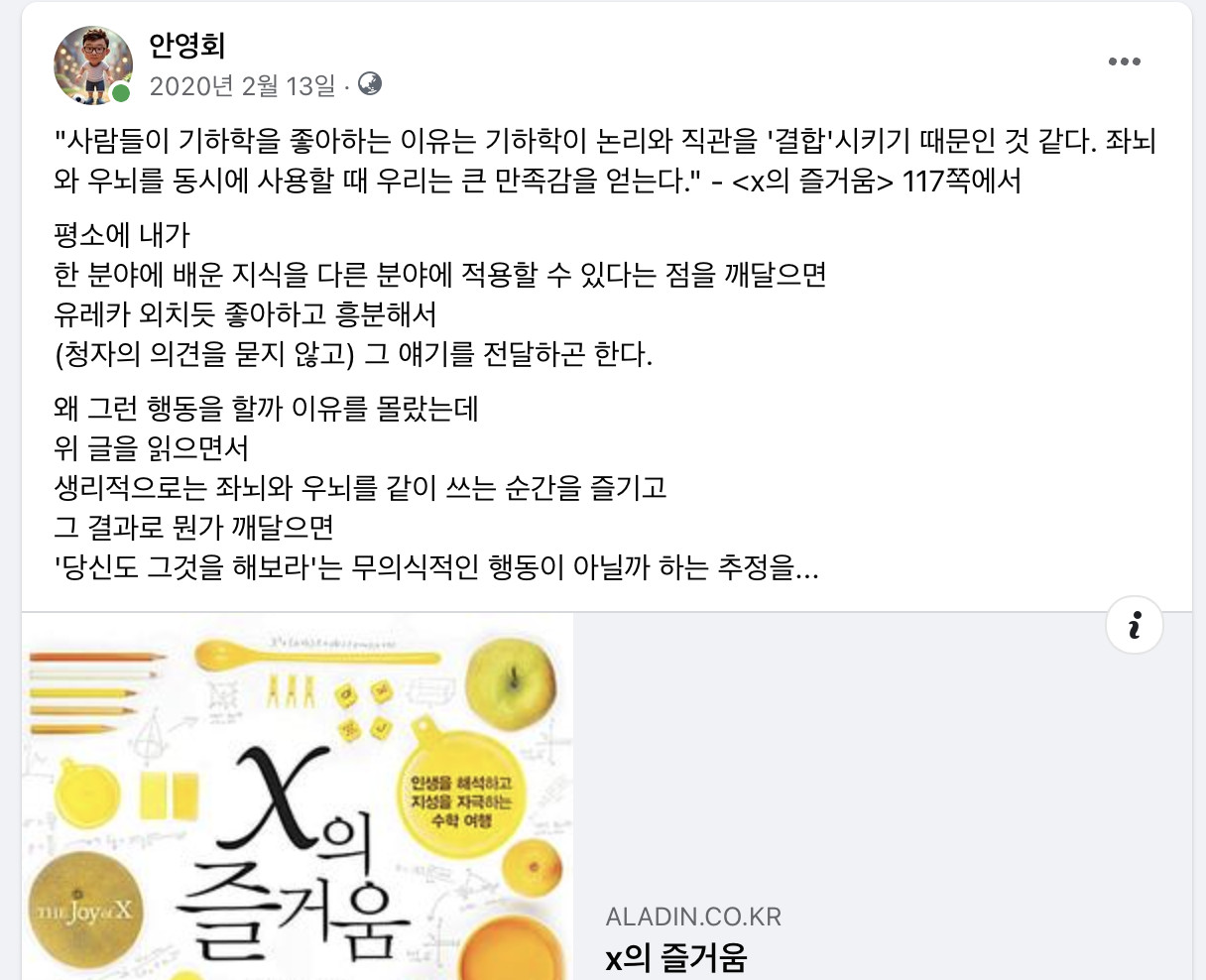학창 시절 수포자였던 제가 스스로 수학 책을 펼친 것은 <x의 즐거움>이 처음이 아닐까 싶습니다. 그 후에 두 아들은 수포자를 만들지 않겠다는 일념으로 비슷한 책을 몰아서 읽다가 제풀에 지치고 말았습니다.