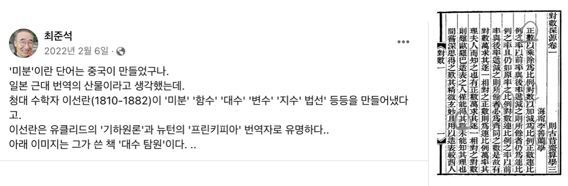 한편, 어떤 경위로 눈에 띄었는지 불분명하지만 최준석 님 페북 글에서 미분이란 단어가 중국에서 만든 말이란 사실을 알게 되었습니다.