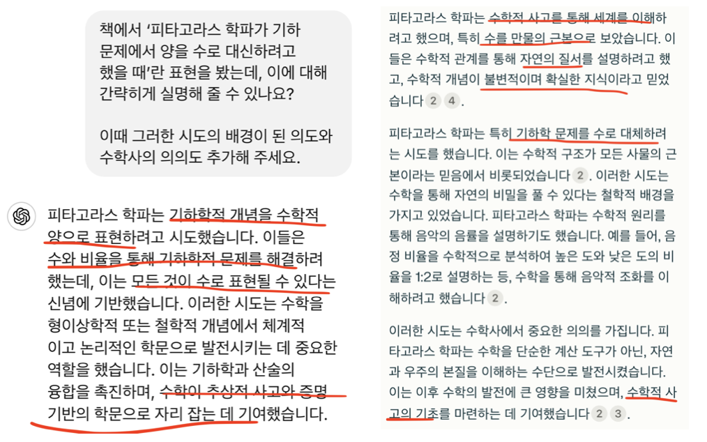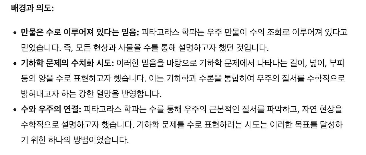 [2] 사용한 프롬프트는 다음과 같습니다: 책에서 ‘피타고라스 학파가 기하 문제에서 양을 수로 대신하려고 했을 때’란 표현을 봤는데, 이에 대해 간략하게 설명해 줄 수 있나요? 이때 그러한 시도의 배경이 된 의도와 수학사의 의의도 추가해 주세요.