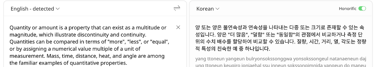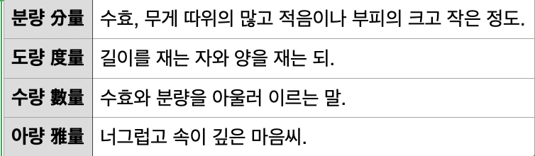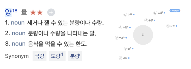사전을 찾아봅니다. 너무나 익숙한 개념인 양에 대해서 처음으로 깊이 생각하는 듯합니다. 사전 풀이에서 '세거나 잴 수 있는'이라는 말을 보니 묻따풀 과정에서 배운 '맛보는 일과 혀와 헤아리다'가 떠오릅니다. 분량과 수량이라는 이분법도 보입니다.