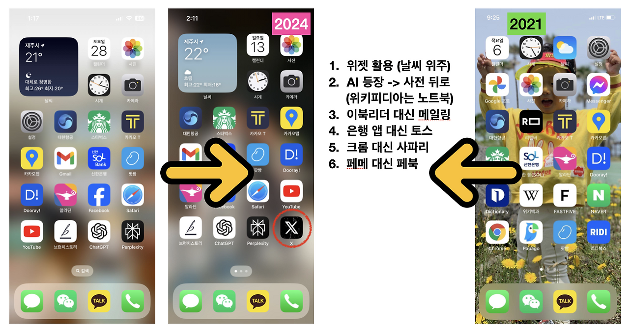 하지만, 2021년 기록과 비교하는 일에서 제 일상의 주요 변화를 읽을 수 있습니다. 일단 그림으로 요약해 보았습니다. 가장 큰 부분은 아이콘 네 개 자리를 차지하는 위젯을 처음으로 쓰게 된 점입니다. 기억에 작년에는 첫 화면에 위젯 두 개를 놓았는데, 올해는 하나만 두게 되었죠.