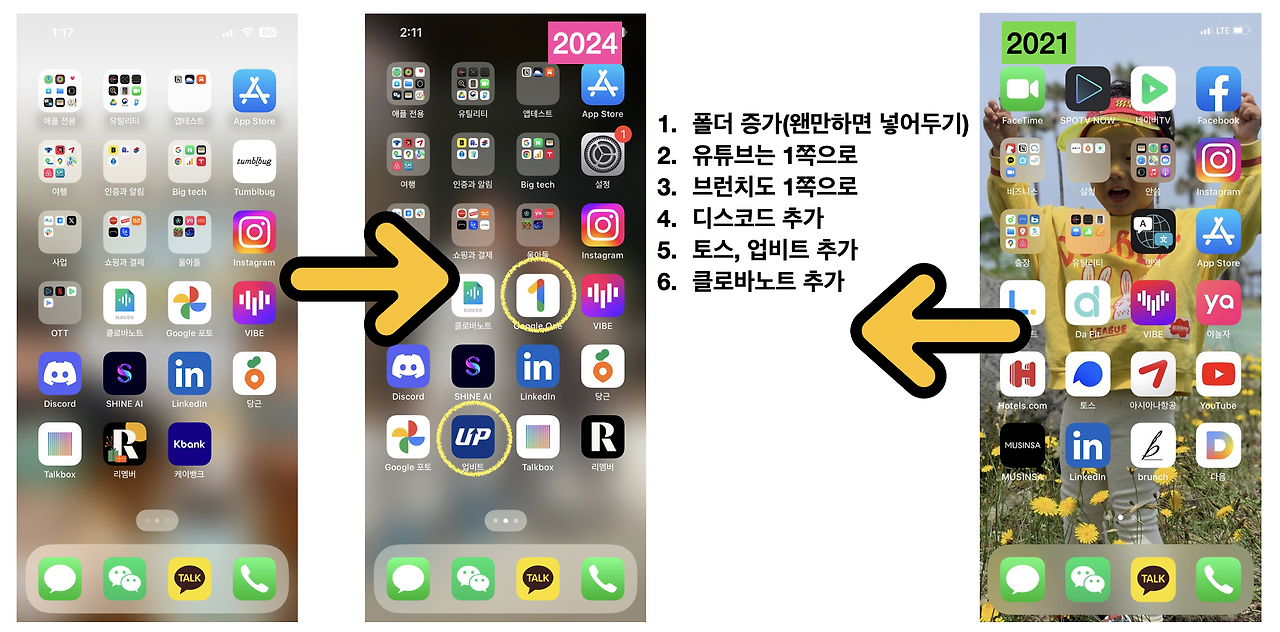 브런치 초기였던 2021년에는 브런치 앱이 두 번째 화면에 있었으나 하루 1, 2개 이상 올리는 요즘은 첫 화면으로 승진(?)했죠. 또한, 장기 투자를 일상화하면서 토스의 쓰임새가 많아졌고, 조만간 주식 외에 비트코인도 포트폴리오로 검토 중이라 업비트 앱도 깔았습니다. 한편, 원격으로 책 읽기를 하면서 쓰게 된 디스코드 그리고 보통 책 처분 용도로 쓰이는 당근이 추가된 점도 눈에 띄네요. 회의록 쓰기 용도로 쓰던 크로버노트는 요즘 회의록 쓸 일이 줄자 쓰임새가 점점 줄어드는 추세입니다.