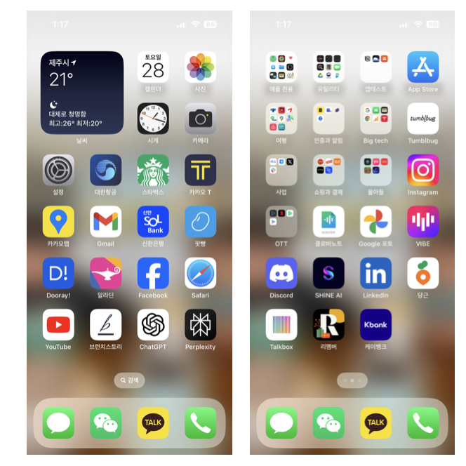 이번에는 오른쪽에 있다가 스와이프 동작으로 호출하는 두 번째 화면입니다. 일단 3년 사이에 폴더가 증가했습니다. 일주일에 한 번 이상 쓰지 않는 앱들은 가급적 폴더에 넣었습니다. 주 1회 정도가 바로 노출하는 대략적인 기준이 된 것이죠. 그리고, 다른 OTT와 함께 오락용으로 구분했던 유튜브는 학습용 도구가 되어서 첫 화면으로 영전(?)했습니다.
