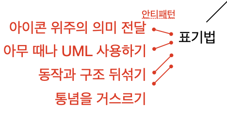 표기법은 네 가지 안티패턴으로 설명합니다. '아무 때나 UML 사용하기'는 제 주변에서는 볼 수 없는 일인데, 저자가 일하는 환경에서는 자주 나타나는 일인 모양입니다.