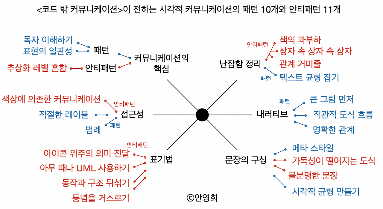 요약하면 저자가 주장하는 (아마도 시각적) 커뮤니케이션의 핵심은 다음 세 가지 항목이라 할 수 있습니다.