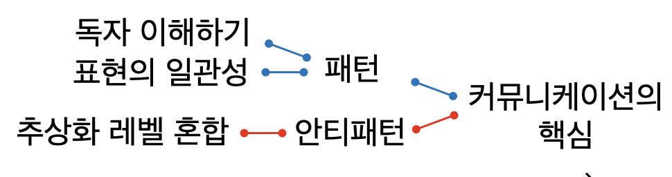 훑어본 바에 지나지 않지만, 골격만 표현하면 1장 커뮤니케이션의 핵심은 간결했습니다. 패턴과 안티패턴의 이분법으로 누구나 이해할 수 있는 '좋은 예'와 '나쁜 예'를 설명합니다. 그런데 사실 3가지 항목뿐입니다.