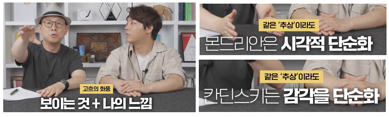 그래서 그는 아예 느낌에 집중하여 이를 추상으로 발전시켰다고 합니다. 그리하여 추상의 계보가 만들어집니다. 영상의 분류에 따르면 고흐는 보이는 것에 느낌을 강조한 추상이라면 몬드리안까지 가면서는 객관의 영역인 시각은 추상으로 가는 흐름이 만들어집니다. 그런데, 칸딘스키는 객관을 버리고 시각이 아닌 느낌을 추상으로 발전시켰다고 합니다.