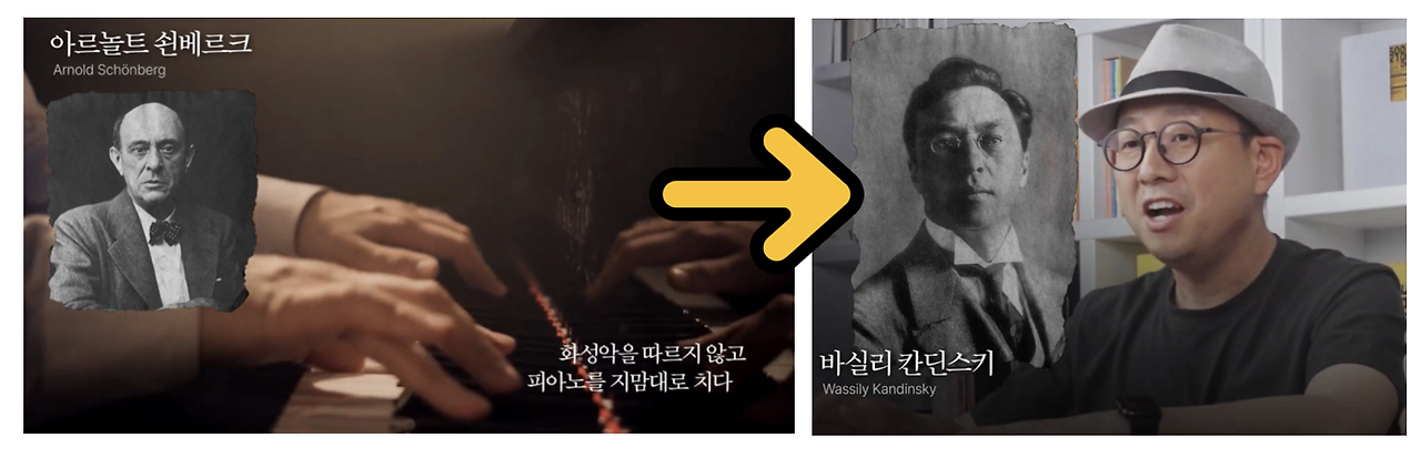 마지막으로 소개되는 인물은 바실리 칸딘스키입니다. 저에게는 아내가 사 둔 책 <점, 선, 면>으로 알게 된 인물이죠. 화가가 왜 이런 철학적인 글을 쓰나 흥미롭게 (일부를) 읽었던 기억이 있습니다. 아무튼 영상에 따르면 그는 쇤베르크가 화성악을 따르지 않고 피아노를 치는 장면에 큰 영감을 받았다고 합니다.