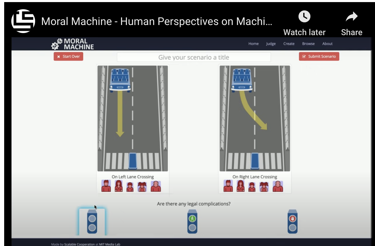 MIT에서는 자율주행차의 윤리적 운행 연구를 위해 윤리적 기계Moral Machine 프로젝트를 수행하고 있다. 이 프로젝트에서는 응급 시에 자율주행차가 취해야 할 행동에 대한 일반 대중의 윤리의식을 조사하고 있다.