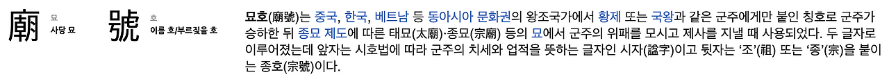 두 번째는 위키백과를 찾으면서 배운 내용입니다. 죽은 임금을 칭하는 이름 자체를 부르는 묘호(廟號)란 말을 처음 알게 되었습니다.