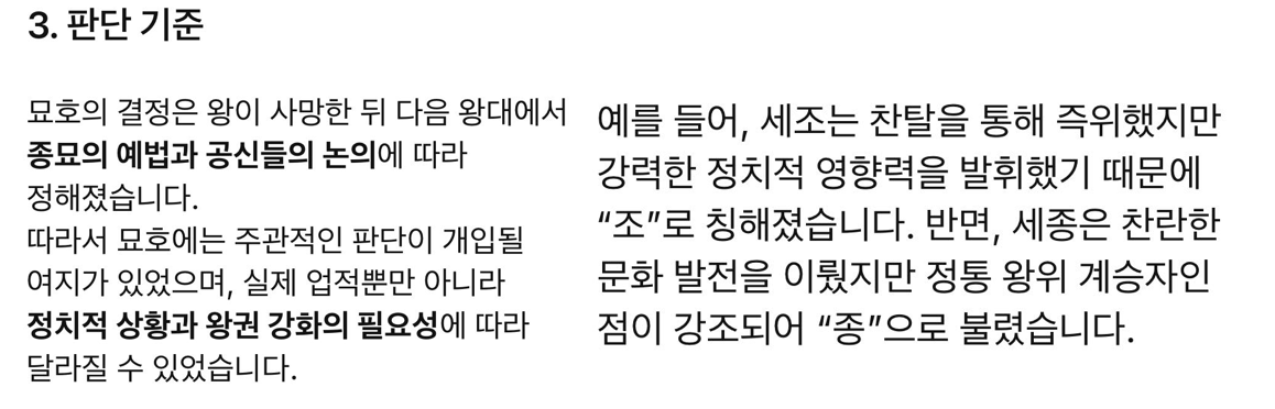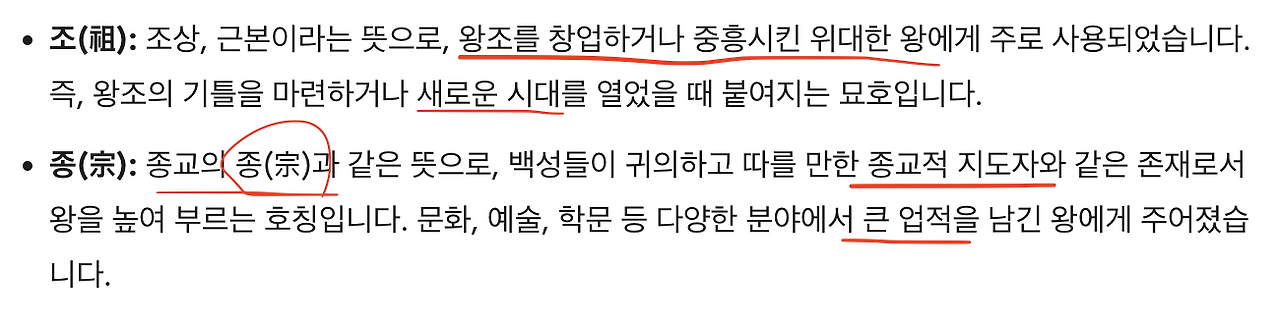 한국사를 다룬 만화에서 왕들을 칭하는 이름이 조와 종으로 끝나는 것들이 많아 아이들이 궁금해하였는데, 저도 모르는 내용이었습니다. 그래서 제미나이에게 물어보았습니다. 답변 내용 중에서 뻔한 오류도 있었지만, 핵심 메시지는 분명했습니다.