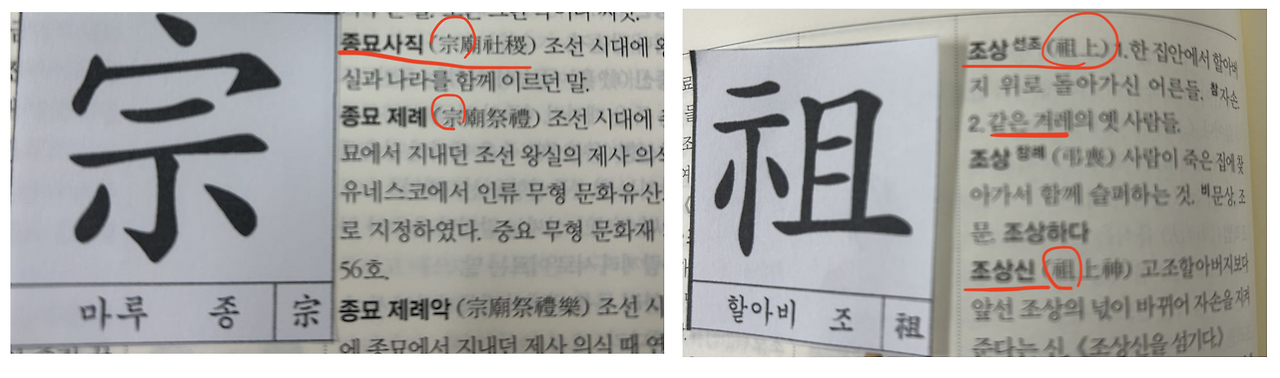 마침 최봉영 선생님께 받은 <첫걸음漢字 600> 가장 앞 쪽에 두 한자가 있었습니다. 먼저 초3 큰 아이에게 할아비祖의 뜻을 읽어 주었습니다. 그랬더니 앞서 보았던 '왕조를 창업하거나'를 떠올리며 '아~, 그래서' 하며 祖자를 부여한 이유를 납득한다는 표정을 지었습니다.