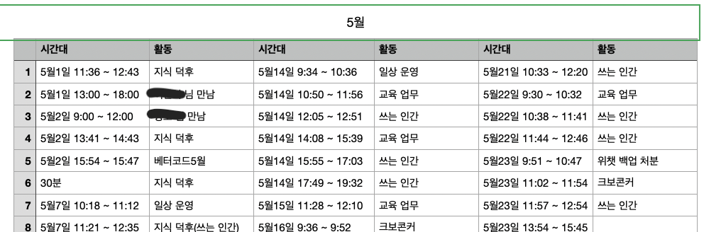 1부 첫 단락의 소제목으로 등장하는 '내 인생의 4,700시간과 바꾼 돈'이란 표현이 먼저 눈에 띄었습니다. 그 숫자에 대해서는 감이 없었지만 시간을 돈으로 환산하는 방식은 저에게도 낯이 익습니다. <가치 있게 시간을 쓰는 일이란 무엇인가?>에서 인용한 일이 있는데, 작년 5월 한 달간 제가 하는 일들이 만들어내는 가치 측정을 시도해 본 일이 있었기 때문이죠.