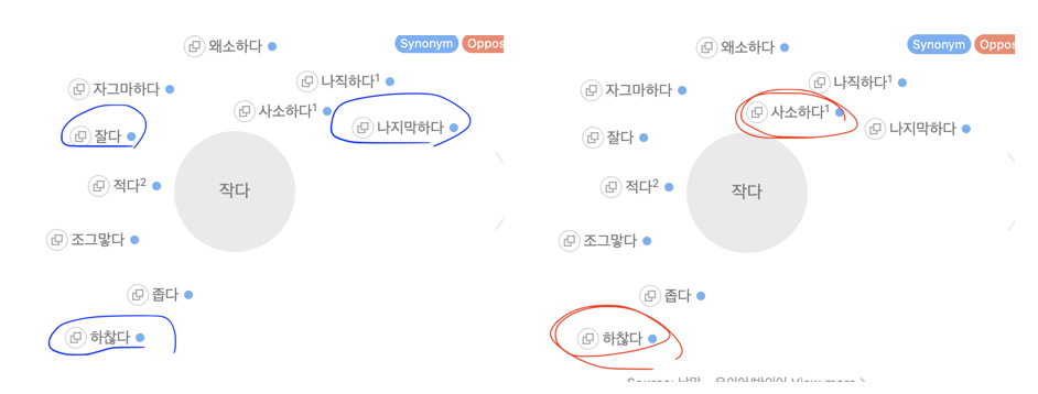 마지막으로 혹시 빠트린 생각이 있는지 점검 차 <낱말의 뜻을 깊고 넓게 묻고 따지는 일의 소중함>을 실천합니다. 사전에서 유의어 관계도를 보니 빠트린 내용이 눈에 띄었습니다. 작년 회고에서도 깨달은 내용이기도 하네요.