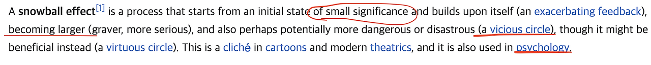 눈덩이 효과는 중요하지 않은 초기 상태에서 시작하여 점점 더 커지는(악화 피드백) 과정으로, 더욱 심각해지고 잠재적으로 더 위험하거나 재앙적일 수도 있습니다(악순환). 그러나 오히려 유익할 수도 있습니다( 선순환). 이는 만화와 현대 연극의 진부한 표현이며 심리학에서도 사용됩니다.
