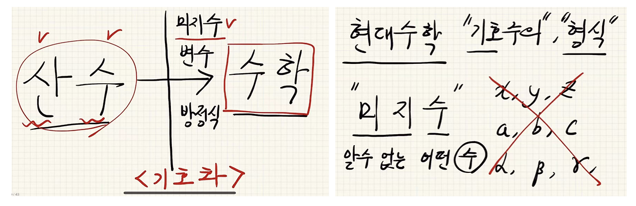 영상에서 제가 받은 메시지는 크게 두 가지입니다. 우선 첫 번째는 산수를 벗어나 수학이 되면 엄밀한 형식을 강조한 기호화가 그 특징이란 점입니다.