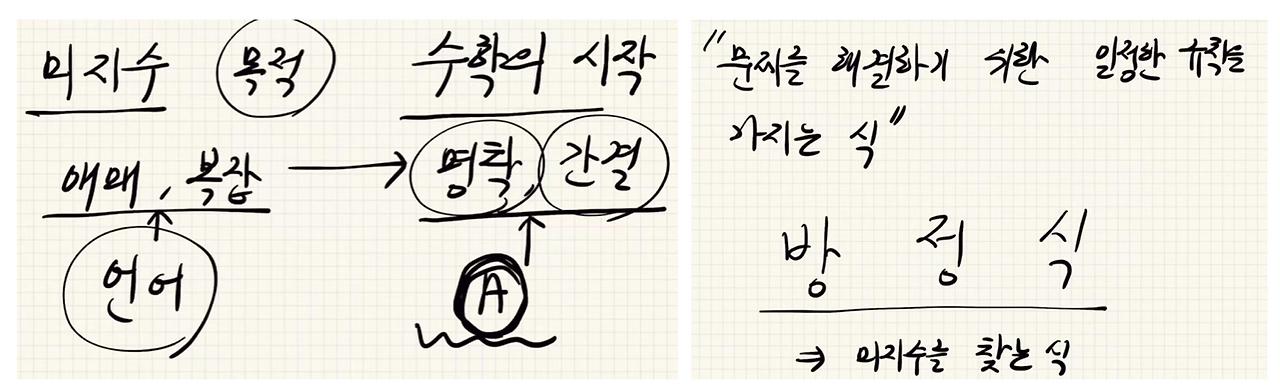이를 위해서 수를 다루던 수학이 알 수 없는 수를 취급하는 완전히 새로운 세계로 확장되었다는 생각이 들었습니다. 이제야 영상 소개에서 저자(크리에이터는 너무 길어서 줄여서 저자라 하겠습니다)가 산수가 아닌 수학의 시작이라 표현했는지 수긍이 갑니다. 더불어 영상 제목에 미지수가 나오는 이유도 알 듯합니다.