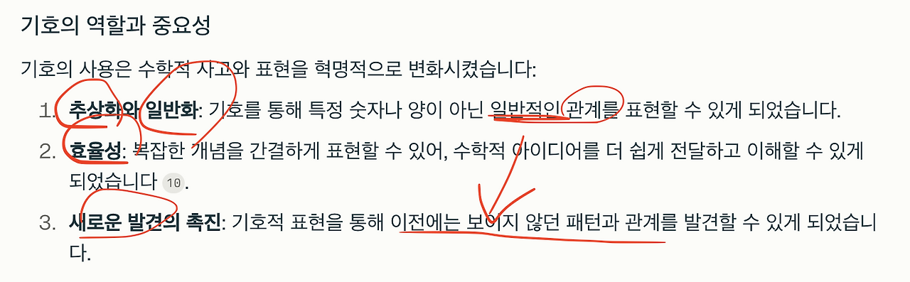 퍼플렉시티 답변 중에서 기호의 필요성과 중요성이라 이름 붙인 단락이 눈에 들어옵니다. 추상화와 일반화 그리고 효율성 따위의 표현이 눈에 띕니다. 이들 개념도 한 번씩 되짚어 보겠습니다.