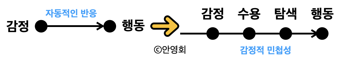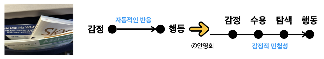 감정의 민첩성이란 감정의 덫에 걸려 자동적인 반응을 하는 대신에 여지를 만들고 행동 변화를 만드는 민첩성을 말하며 지난 글에서 그림으로 도식화한 일이 있습니다.