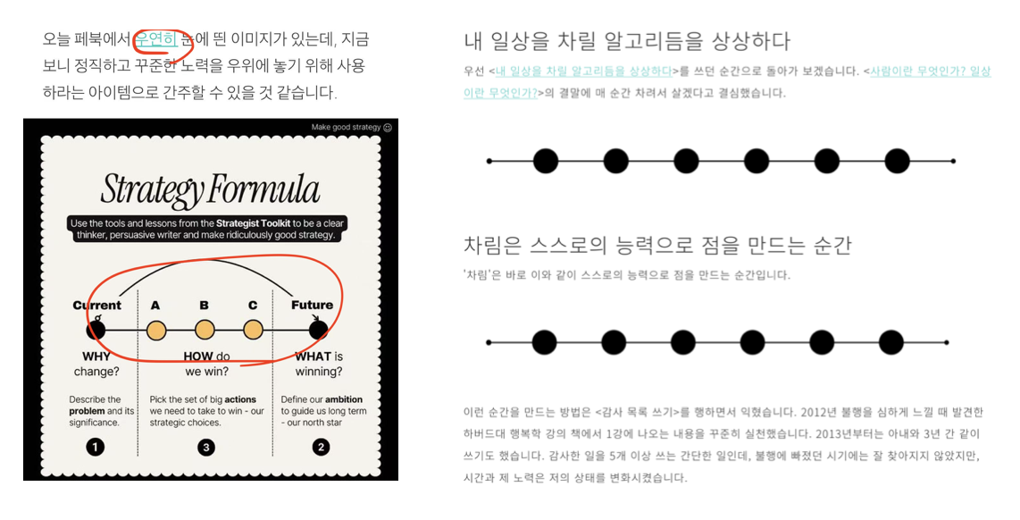 <지금 이 순간의 편안함에 낚이지 말고 의미를 따지자>를 쓸 때 페북에서 본 전략 공식 이미지가 떠오른 이유는 절차를 하나의 패턴으로 인식했기 때문입니다. 제가 느낀 것을 구체적으로 설명해 보겠습니다.