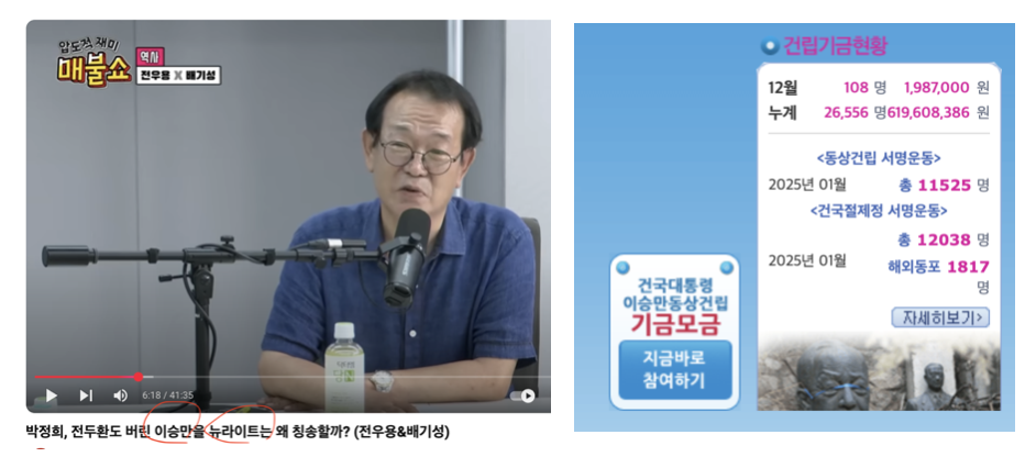 전우용 교수님에 따르면 뉴라이트는 기회주의와 이기주의를 인간의 본성으로 보고, 이완용이나 이승만 같은 인물을 인간의 본성에 충실했던 롤 모델로 재평가한다고 이해했습니다. 이어서 퍼플렉시티를 통해서 건국전쟁 영화 제작과 후원 기관을 찾아봤습니다. 제작사는 트루스포럼인데, 2017년 박근혜 탄핵 반대를 외치며 만들어진 조직입니다. 또 다른 후원사로 대한민국사랑회가 있습니다. 홈페이지를 보니 이승만 동상 건립 모금을 전면에 걸고 있습니다. 뭘 하는 곳인지 대략 짐작할 수 있습니다. 건국전쟁과 뉴라이트의 상관관계를 대략 이해한 듯합니다.
