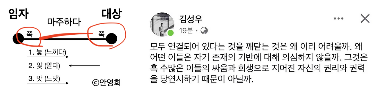 그리고, 어울림을 따지면서 앞선 그림을 다시 보는데 어울리게 되면 임자와 대상이 쪽과 쪽의 관계는 맺는다는 데에 생각이 미쳤습니다. 그랬더니 아침에 페북에서 읽었던 김성우 작가님의 글이 떠올랐습니다.