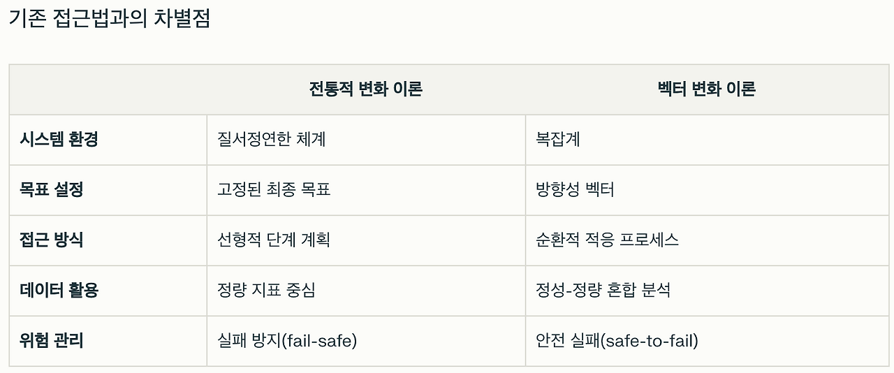벡터 변화 이론(Vector Theory of Change, VTOC)은 데이브 스노든(Dave Snowden)과 사이네핀 센터(The Cynefin Centre)가 개발한 복잡계 시스템에 적용되는 변화 관리 접근법입니다. 기존의 인과관계가 명확한 체계적 환경과 달리, 역동적이고 예측 불가능한 복잡계 환경에서 효과적으로 작동하도록 설계되었습니다.