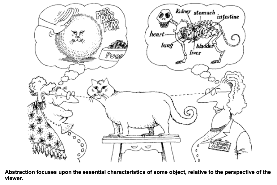 Grady Booch는 물리학이 아니라 생물학적 비유를 들어 설명했습니다. 25년 전쯤에 읽은 책이기 때문에 지금 갖고 있지 않습니다. 대신 퍼플렉시티가 있어 질문을 했습니다. 놀랍게도 그의 책 이전 버전(2판) OBJECT-ORIENTED ANALYSIS AND DESIGN은 공개가 된 모양입니다. PDF로 전문을 볼 수 있네요? 퍼플렉시티가 추려 준 탓에 훑어봤는데, 눈에 쉽게 들어온 그림은 '추상의 효과'를 강조한 그림입니다.