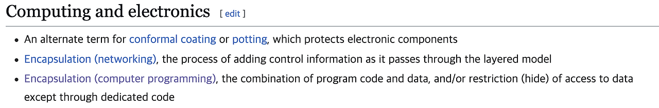 캡슐화(Encapsulation)를 찾아보면 약에서 출발해서 주로 전자 기기와 컴퓨팅 분야로 말이 퍼져 나간 흔적을 볼 수 있습니다.