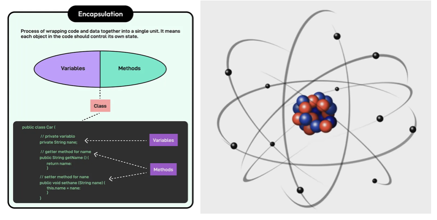 마치 핵을 구성하는 입자들과 그 주위를 운동하는 전자를 묶어 원자를 만든 것과 변수를 묶어 다양한 상태를 표현할 수 있는 구조체와 행위를 표현하는 메소드(혹은 함수)를 묶어 객체를 만든 것에 공통점이 있다는 생각이 듭니다.