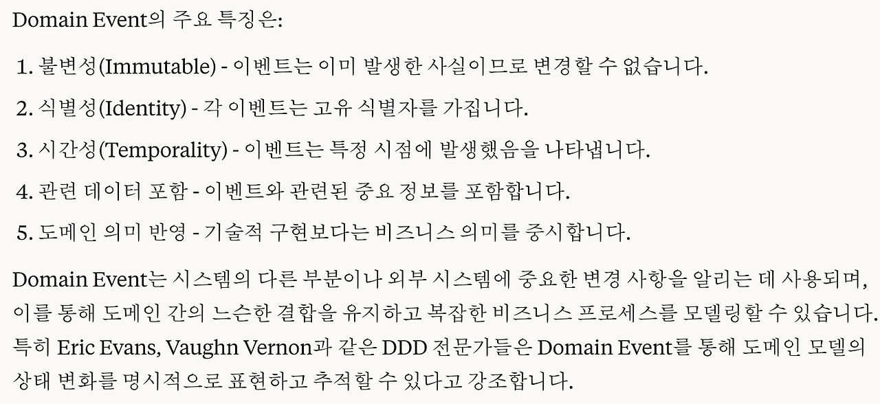 다만, DDD의 Domain Event와 넓게 보아 같은 범주라고 보고 붙인 분류인데, 이를 엄격하게 고려한 것은 아닙니다. 참고로 DDD를 주창하는 사람들이 말하는 Domain Event에 대해 클로드에게 물었습니다.