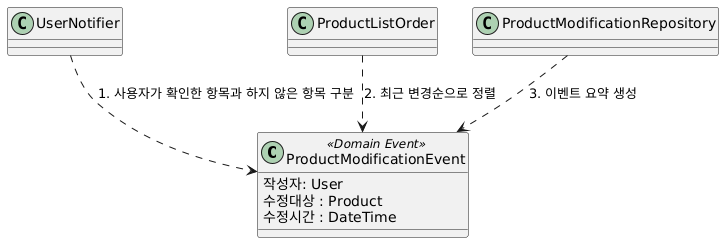 보통은 관계의 이름을 넣게 되지만, 글을 읽는 분들이 따라올 수 있게 하려고 이렇게 표시한 것입니다. 마지막으로 ProductModificationEvent 위에 부가적으로 Domain Event이라고 붙였는데요. UML에서 스테레오타입(stereotype)이라고 하는 부가적인 분류입니다.