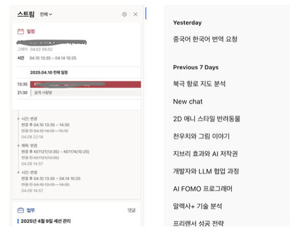 마침, 업무용 화면 기획을 해야 하는데 적당한 예시가 될 듯했습니다. 먼저 사용자 경험에 영향을 끼친 사례를 살펴보겠습니다. 아래 그림에서 좌측에 보이는 것은 제가 거의 매일 쓰는 두레이에서 최신 순으로 변경사항을 볼 수 있게 해 주는 스트림 UI입니다. 우측은 ChatGPT의 채팅 이력인데, ChatGPT뿐 아니라 거의 모든 생성형 AI 서비스의 필수 UI 요소로 자리 잡았죠.