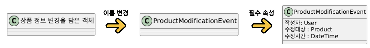 그러고 나서 이벤트에 담기는 정보를 속성으로 정의합니다. 변경 사실을 담는 객체에 있어 변경 사실이 그 본질에 해당하니까요. 누가 언제 무엇을 변경했느냐가 되겠죠. 상품 정보가 많을 때 어떤 것을 바꾸었는지 나타내기 위한 상세 내용은 이 글의 목적 밖이기에 생략하겠습니다.