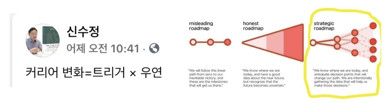 두 글에 담긴 메시지를 골자만 압축하면 다음 두 개의 그림으로 표현할 수 있습니다. 우연은 맞이해야 하니 트리거를 많이 만들수록 확률이 높아진다는 것이고요. 그다음으로 무작정 점으로 열심히 할 수도 있지만, 계획이 있다면 환경과 주변을 고려해야 정렬해 나갈 수 있다는 점을 나타낸 전략적 로드맵입니다.