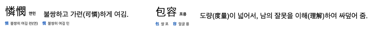 그리고, 다음 제목 '시선: 관점에 따라 다르게 보인다'에서는 조금 다른 맥락의 기억으로 옮겨갑니다. 최근에 썼던 <중심을 어디에 두는가만으로도 달리 보이는 세상> 탓이겠죠. 한편 '포용: 살아 있는 모든 것은 존재 이유가 있다'를 볼 때는 작년에 훈련했던 낯선 개념인 연민()이 떠올랐습니다.