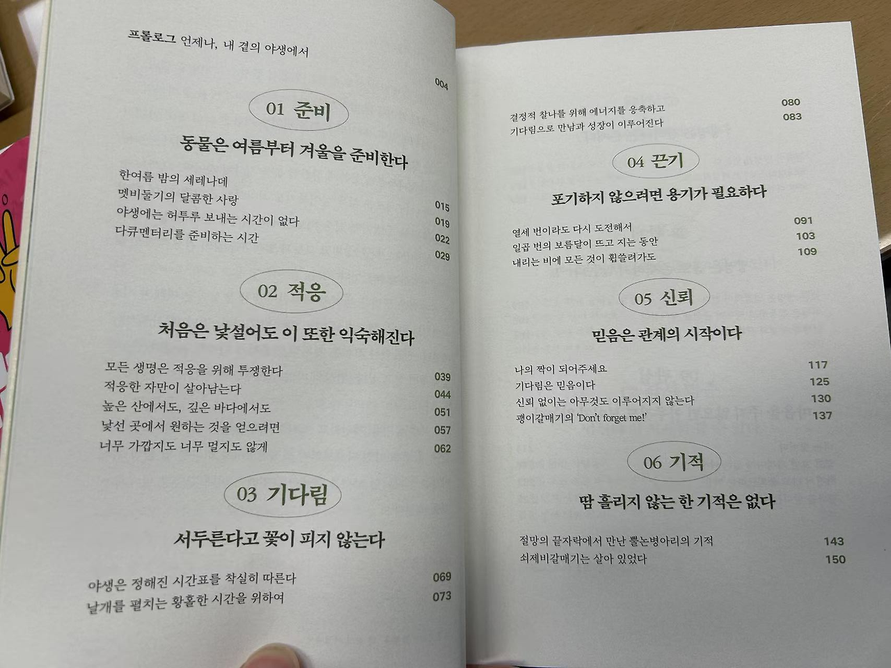 두 번째 제목은 '처음은 낯설어도 이 또한 익숙해진다'입니다. 최근 확고하게 자리 잡은 제 학습 전략이기도 합니다. 하지만, 그 장에서 가장 눈에 띄는 제목은 '모든 생명은 적응을 위해 투쟁한다'였습니다. 종종 약해져서 지인들에게 위로를 구하던 제 모습이 부끄럽게 느껴졌습니다. 적응이란 그런 것이군요.