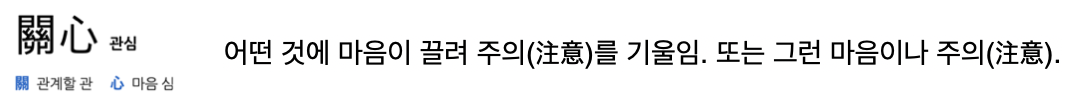 이어서 다음 제목 '관심: 마음을 주지 않으면 아무것도 보이지 않는다'를 보면서 또다시 반성을 합니다. <당신이 옳다> 다독 덕분에 조금은 이해하게 되었지만, 아직도 숙련되지 않은 행동이죠. 그래서 낱말의 뜻을 깊고 넓게 묻고 따지는 일의 소중함도 실천할 겸 관심을 한자 사전에서 찾습니다.