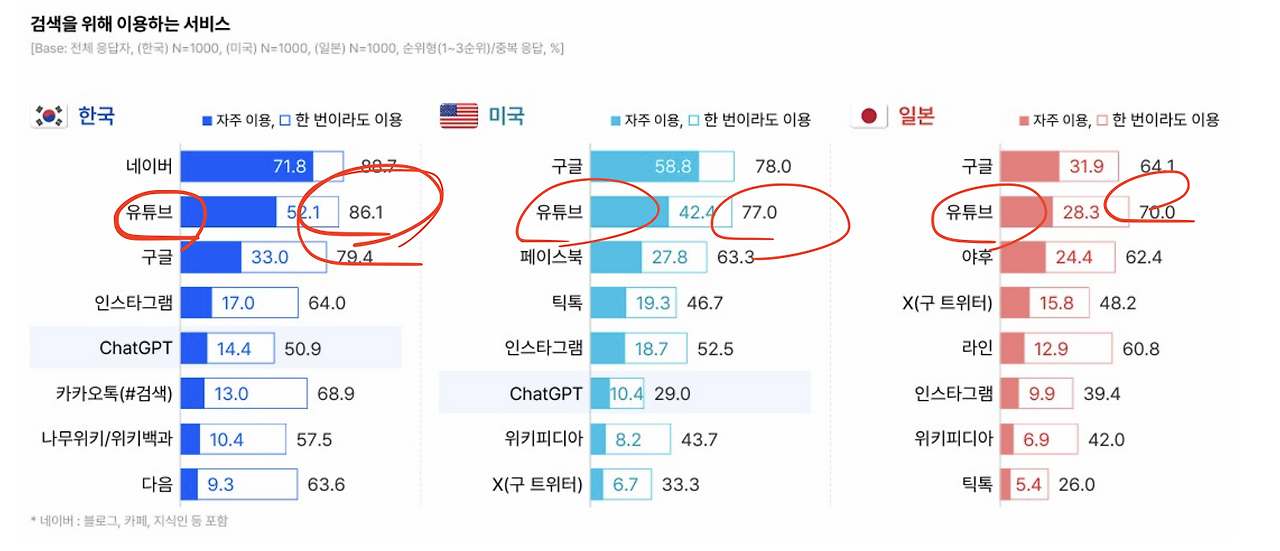 기사에서 인용한 그래프를 보면 한미일 3국에서 유튜브를 이용한 검색은 모두 2위이며, 한국은 특히 더 높다는 점이 눈에 띕니다.