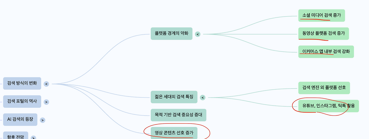 저는 <구글 노트북LM을 이용한 기사 내용 내비게이션>을 적용하여 윤곽부터 봅니다. ‘검색 방식의 변화’ 항목의 하위 구조가 눈에 들어옵니다. 브라우저에서 웹을 탐색하는 사람이나 빈도가 줄고, 유튜브나 인스타 혹은 틱톡 사용자가 늘고 있죠. 또, 상품 검색은 특정 앱 안에서 하는 경우가 확실히 눈에 띕니다.