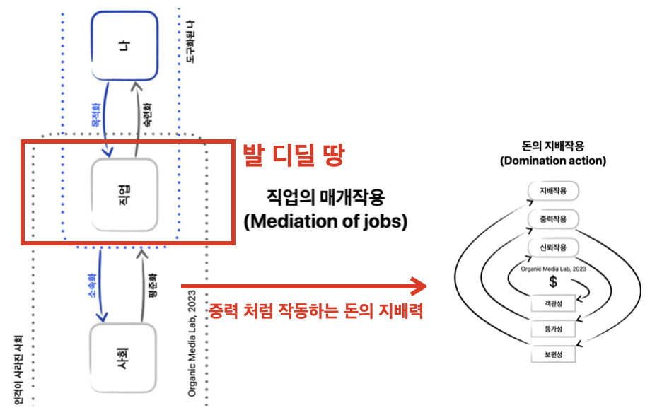 당시 글에 담은 핵심 메시지를 다시 그림으로 표현해 봅니다. 자본주의 사회에서 돈이 신뢰, 중력, 지배작용을 한다는 <WHY>의 설명을 채용한 것이죠. 그렇게 보면, 직업은 마치 사회에 발 디딜 땅과 같은 역할을 합니다. 직업이 바로 돈이 사회를 지배할 때, 그 매개체로 쓰이는 것이라 하겠습니다.