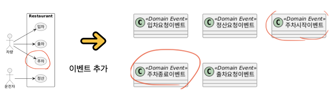아무튼 그렇게 3가지 뷰로 모델이 시각화되고 있습니다. 상태도에서 드러난 '주차' 상태를 실체화Realization하기 위해서 '주차'를 유스케이스로도 식별하고 주차의 시작과 종료를 사건으로 포착하는 두 개의 이벤트를 추가로 식별합니다.