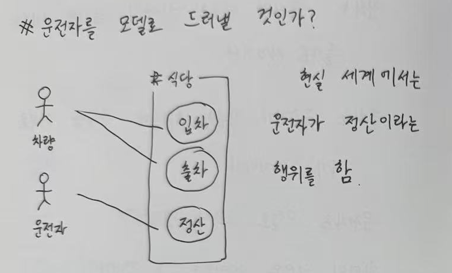 먼저 첫 번째 내용은 제 글을 보고 동료가 배우고 익힌 내용이라 하겠습니다. 다만, 동료의 글 즉, '현실 세계에서는 운전자가 정산이라는 행위를 함'을 보면 액터(Actor)로 운전자를 모델링할 필요를 인식한 것으로 볼 수 있습니다. 행위를 하려면 행위자가 필요합니다.