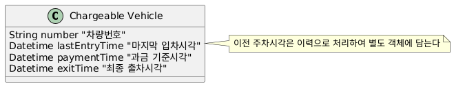 그리고, 필수적인 속성을 생각해 보겠습니다. 먼저 차량 번호가 있겠죠. 다음으로 정산을 위해 알고 있어야 할 시간들을 따져 보았습니다. 가장 먼저 입차시간과 출차시간이 있는데, 앞서 다룬 바대로 정산을 요청하는 시점에서 계산이 벌어질 수 있습니다. 고객 편의를 위한 고려죠.