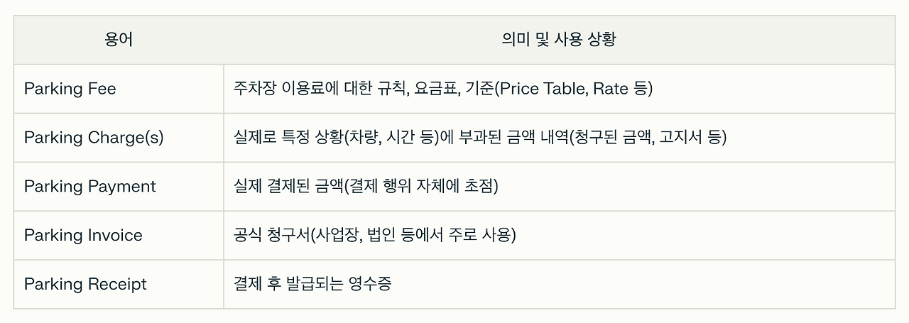 정산이라는 말도 다소 모호한 감이 있어 풀어봅니다. 그림을 보면 주차면에 머문 시간을 기준으로 과금을 하는 것이란 점을 알 수 있습니다. 클래스도로 나타내 보려고 마음을 먹었더니 이내 가급적 영어 표현을 쓰려는 관성이 작동했습니다. 그래서, 퍼플렉시티에 질문을 하는 과정에서 프롬프트 수정을 하게 되었습니다. 그러는 과정에서 자연스럽게 모호한 생각에 갈래가 생기고 개념들이 조금씩 차려졌습니다.