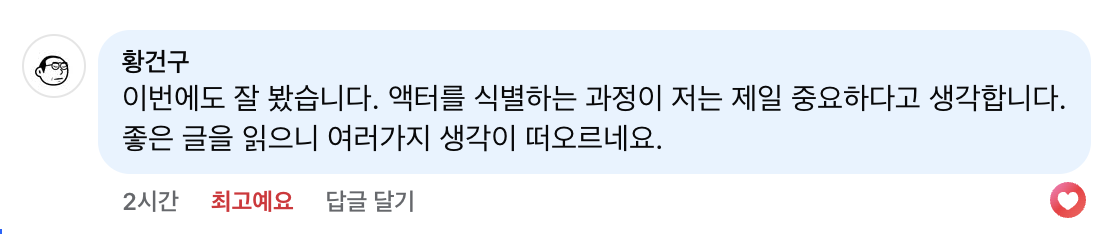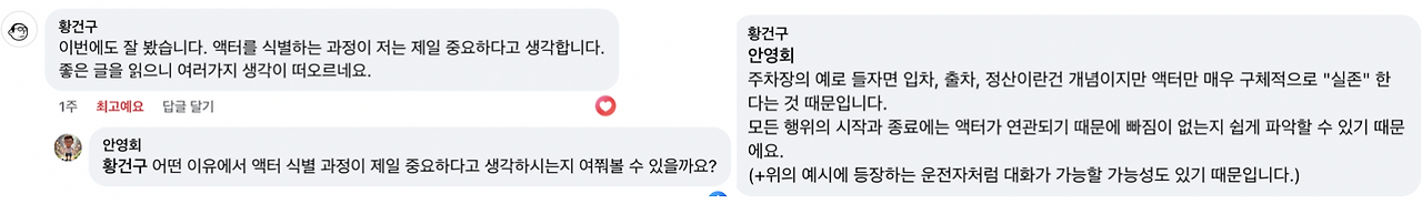 <모델링에서 행위자를 뽑는 일은 시스템 맥락을 만드는 일>을 페이스북에 공유했더니 다음과 같이 황건구 님의 댓글이 달렸습니다. 페북이 릴레이 하는 원격 대화가 생각을 나누는 즐거움을 줍니다. 말로만 듣던 옛날 서신 교환이 이렇게 이뤄졌나 싶은데, 아무튼 그 생각을 나누는 즐거움을 누리는 글입니다.